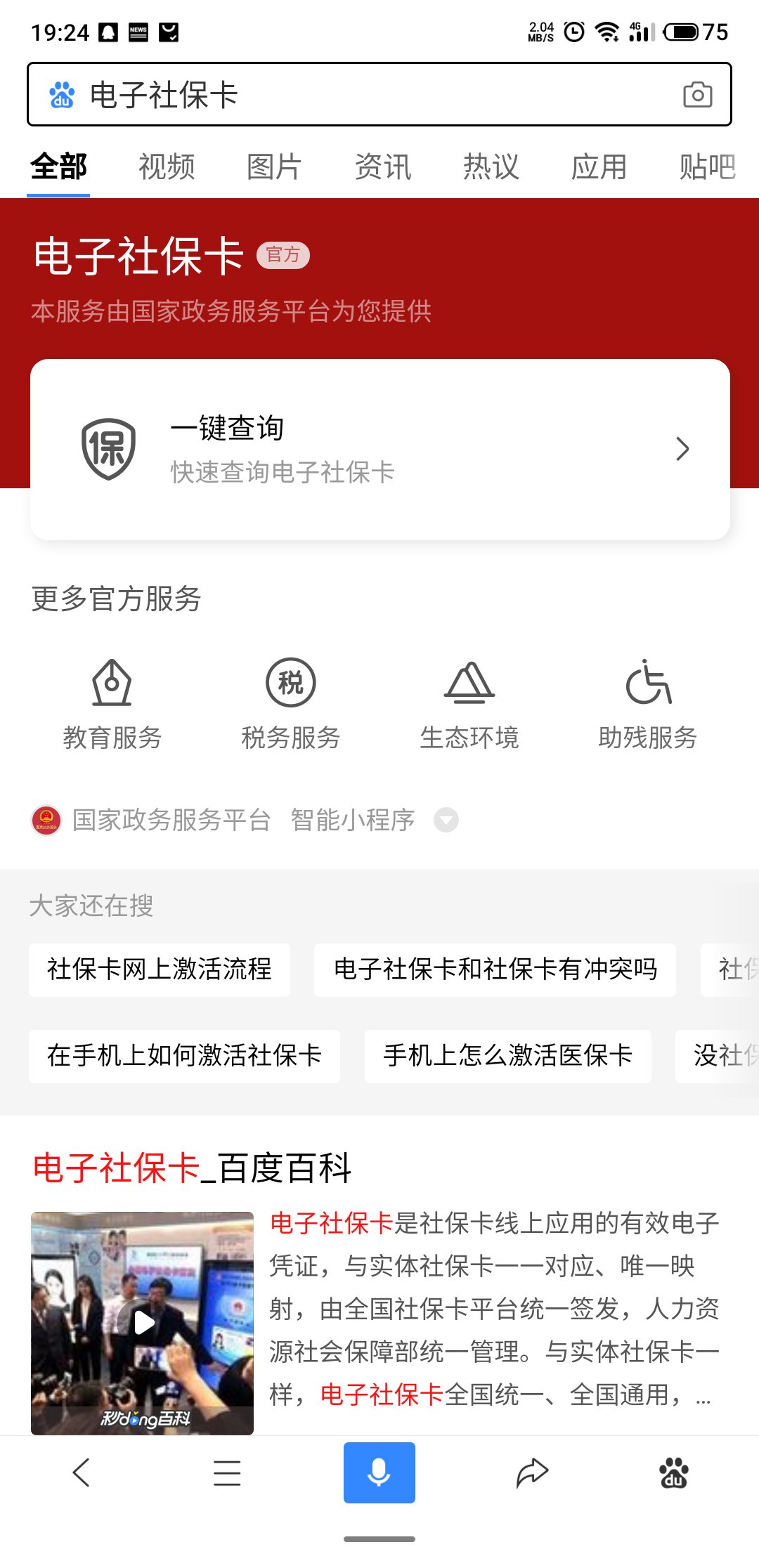第一步:进入百度APP,搜索『电子社保卡 』,点击进入