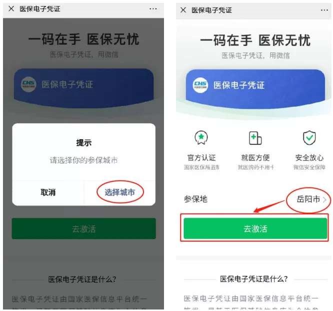 第五步:按照提示选择参保城市后,点击“去激活”;