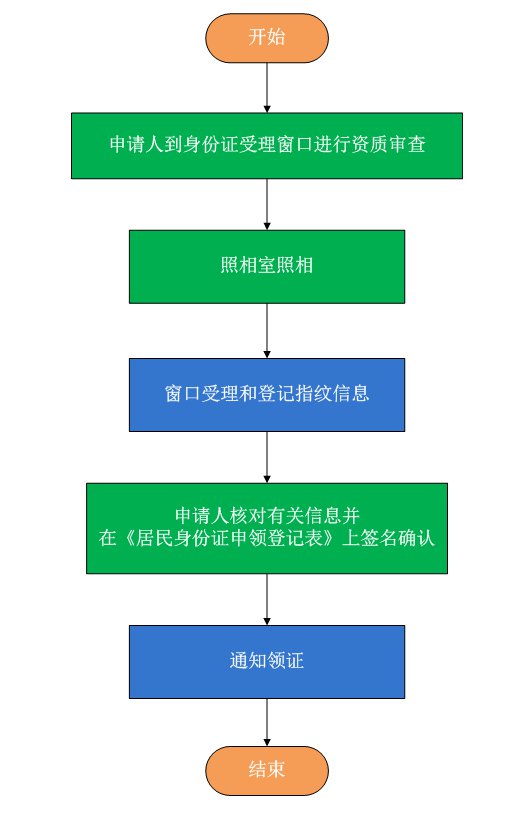 申请人网上提交申请业务信息和资料—湖南省居民身份证管理信息系统受理—支付制证费—县(市、区)公安人口与出入境部门审签—制证并邮寄办结