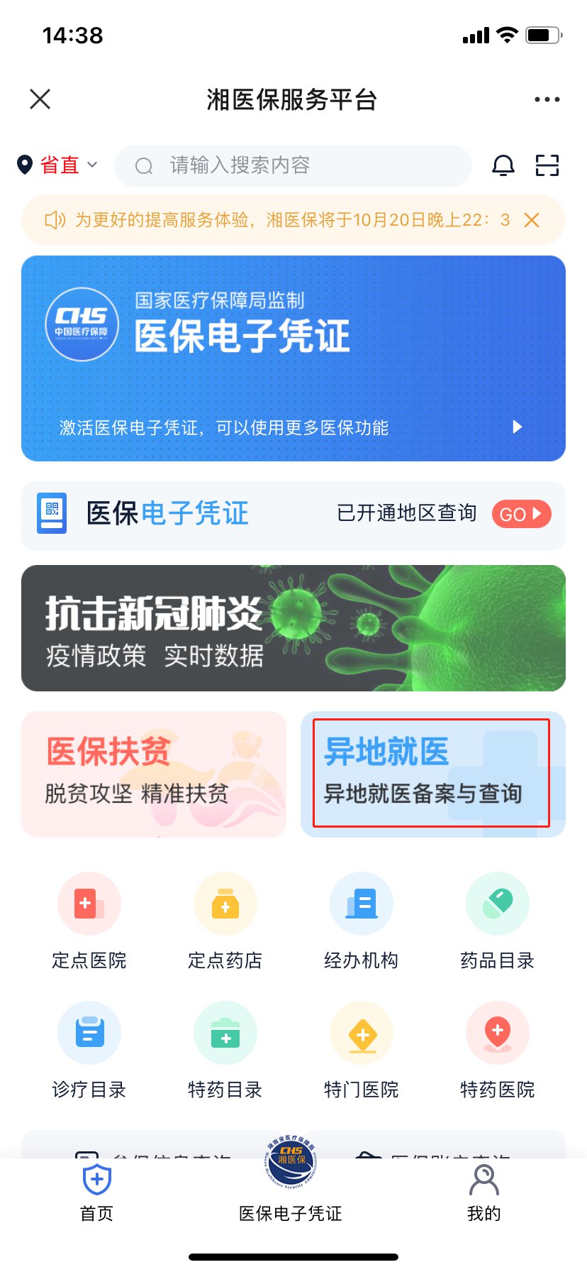 2、进入湘医保服务平台,(这里可查定点医院、定点药店、经办机构、药品目录,还可办理参保凭证打印、缴费明细打印、基本信息变更)选择异地就医备案。