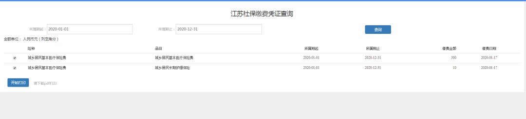 (5)选择需要打印的“缴费所属期”,点击“查询”,勾选需要打印的项目,点击“开始打印”,即可下载打印电子票据。