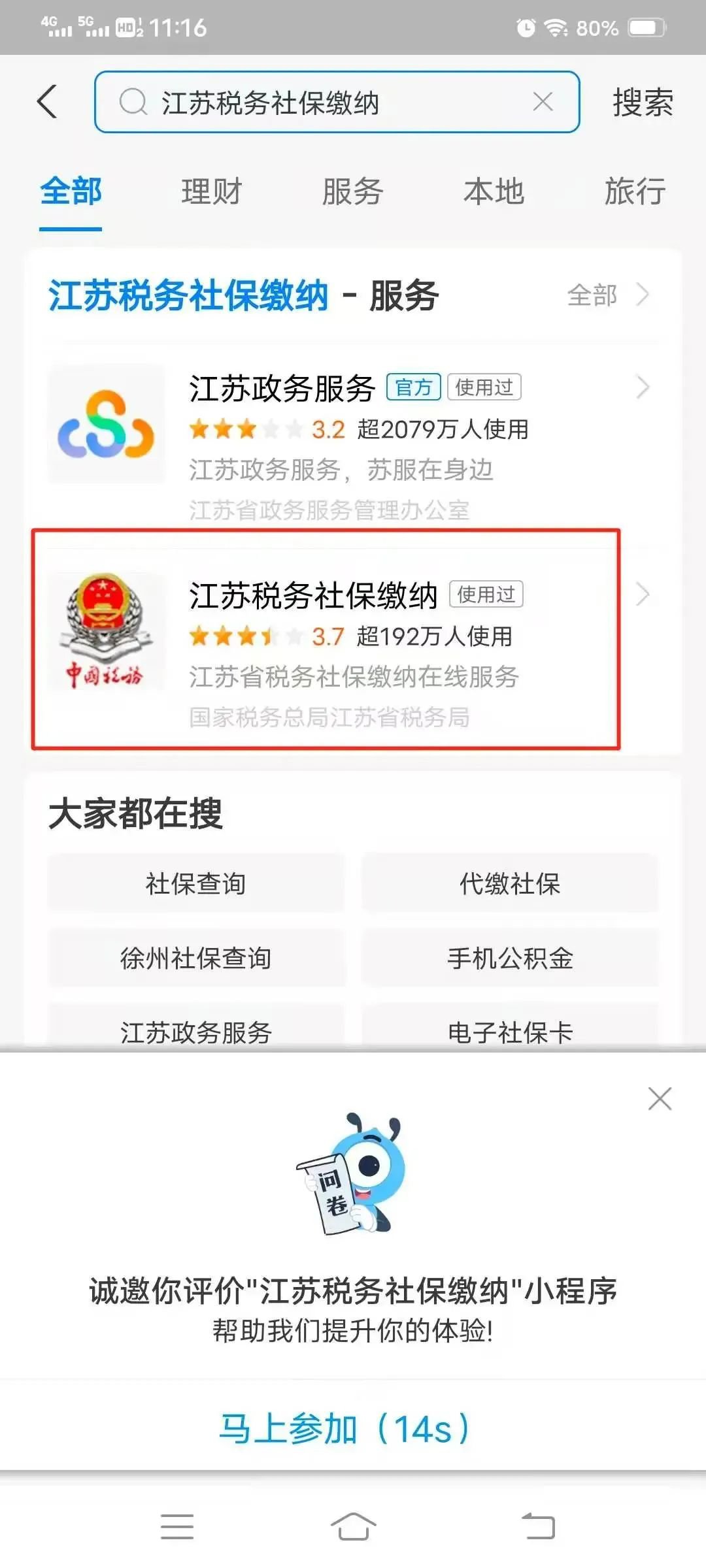 在首页搜索“江苏税务社保缴纳”,点击进入。首次使用时,需完成实名认证,缴费流程参照微信方式。
