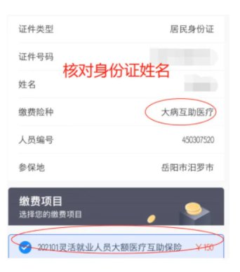 核对身份证号、姓名、缴费险种,确认无误后点击下方“202101灵活就业人员大额医疗互助保险”。