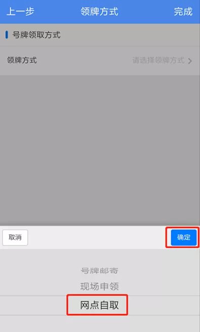 步骤六:点击【领牌方式】,选择“网点自取”方式,点击【确定】,点击【领牌网点】,选择相应的网点后点击【确定】