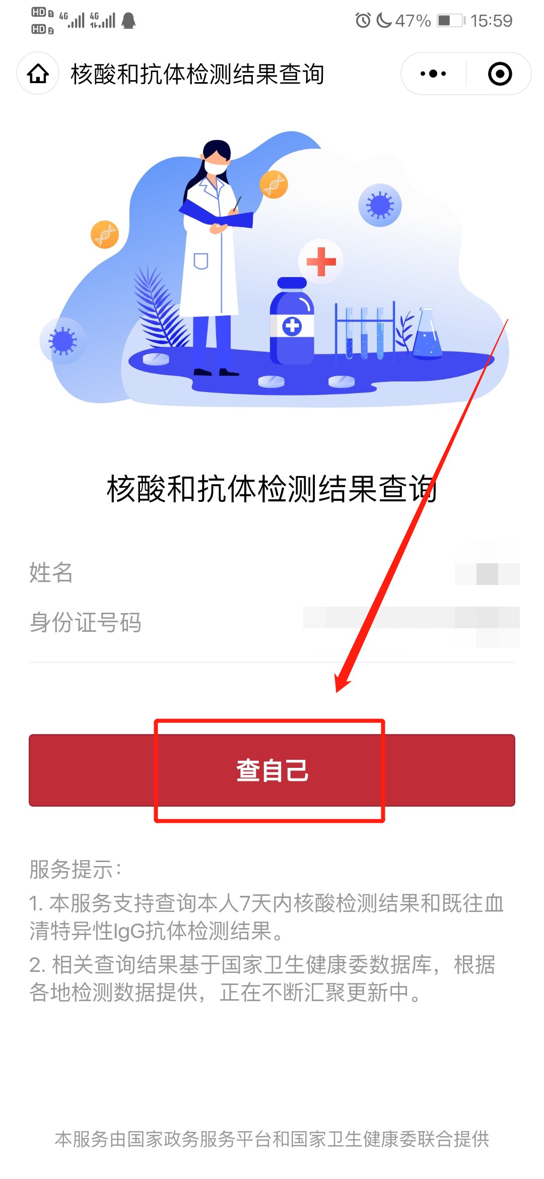 3.在查询页面输入个人姓名和身份证号码后,点击下方的“查自己”即可查询到个人相关的核酸检测结果,如下图所示。