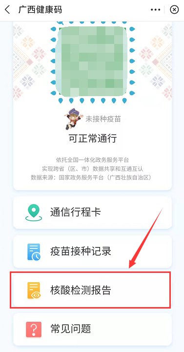3、进入广西健康码页面后,点击【核酸检测报告】即可查询