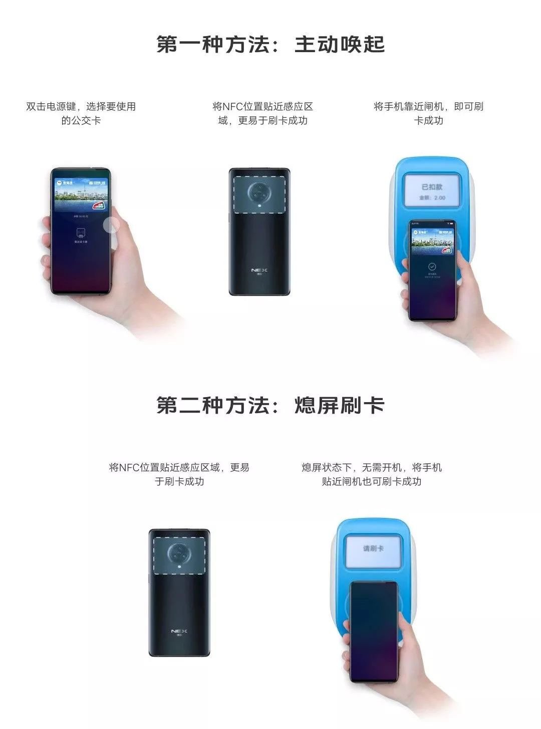 温馨提示:iQOO/iQOO Pro、iQOO 3、NEX 3系列、X30系列、X27 Pro的刷卡感应区域如下图: