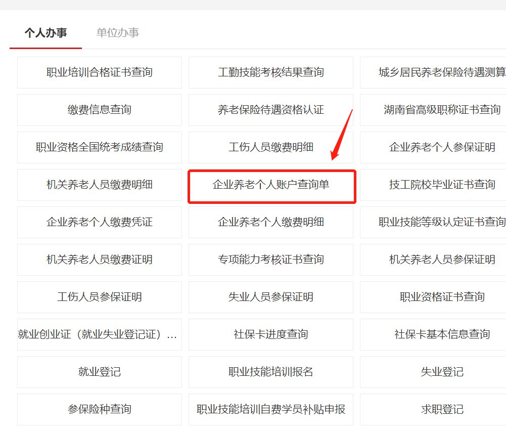 2、点击进入湖南省人力资源和社会保障厅首页,在【个人办事】板块,点击“企业养老个人账户查询单”查询