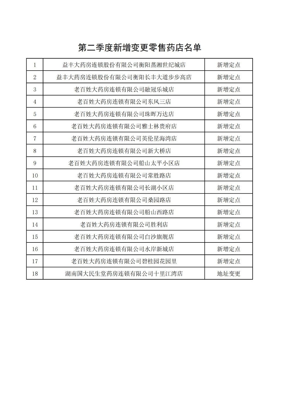 6月下旬,市医保中心定点协议服务科按照《零售药店医疗保障定点管理暂行办法》(国家医疗保障局令第3号)相关要求,组织有关人员对益丰大药房连锁股份有限公司衡阳蒸湘世纪城店等18家零售药店申请开通市本级职工医保业务或地址变更的医药机构进行了现场核查。经核查,共有18家医药机构符合准入条件,拟予以开通本级职工医保相关业务(相关名单附后),特此公示。