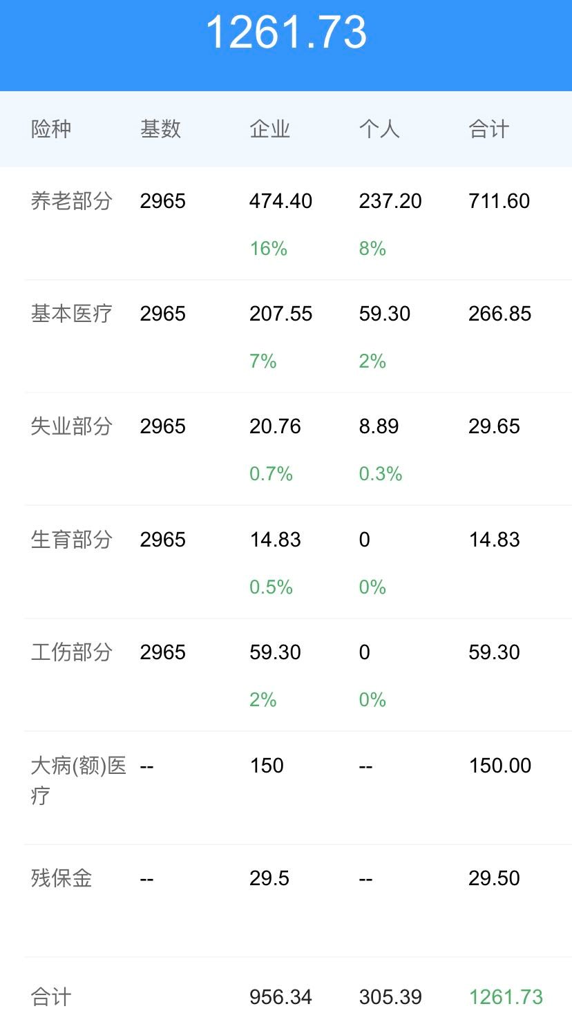 工伤:企业:2% 最低基数:2965元