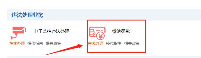 互联网注册用户在互联网登录后,点击【违法处理业务】→【缴纳罚款】进入缴纳罚款流程。