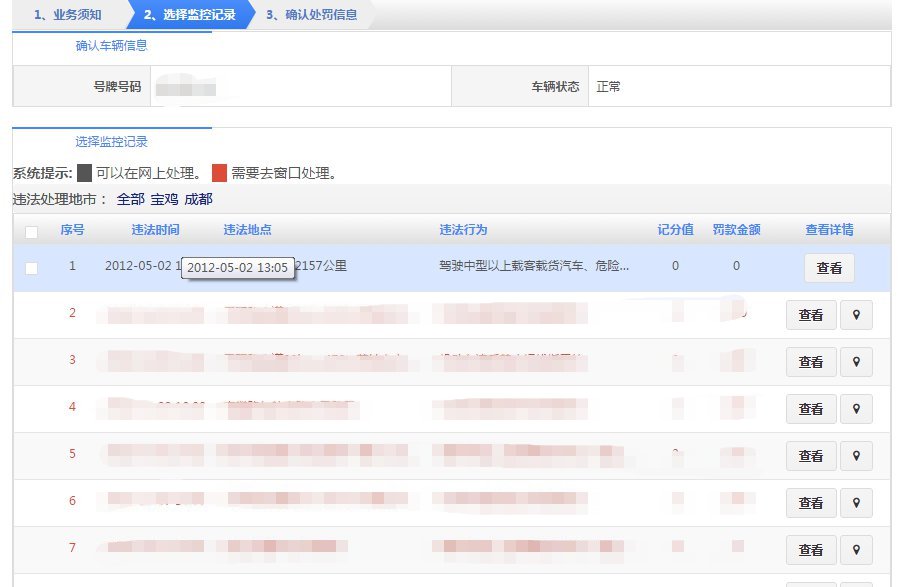 在该步骤,选择需要处理电子监控的机动车,界面如下图所示: