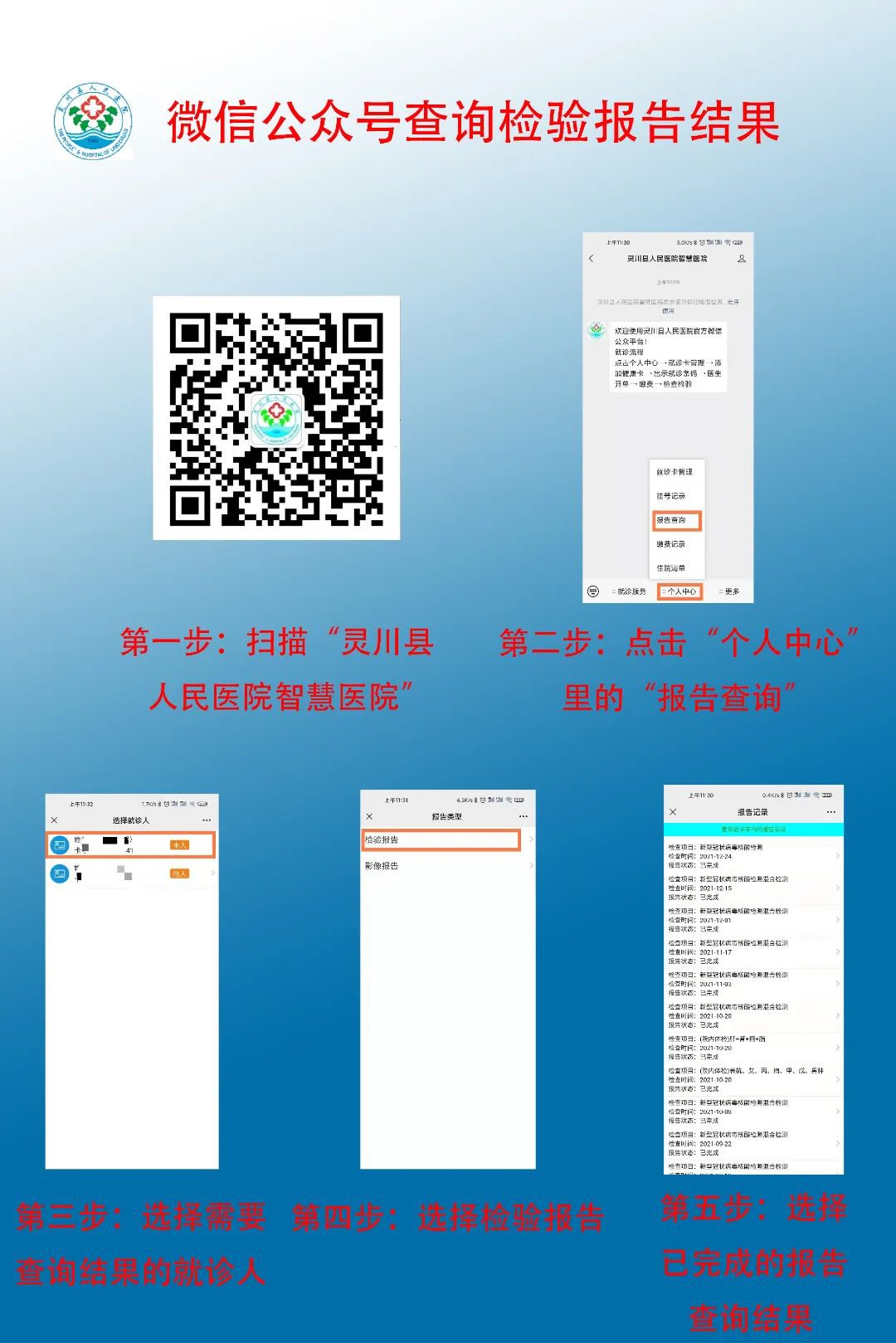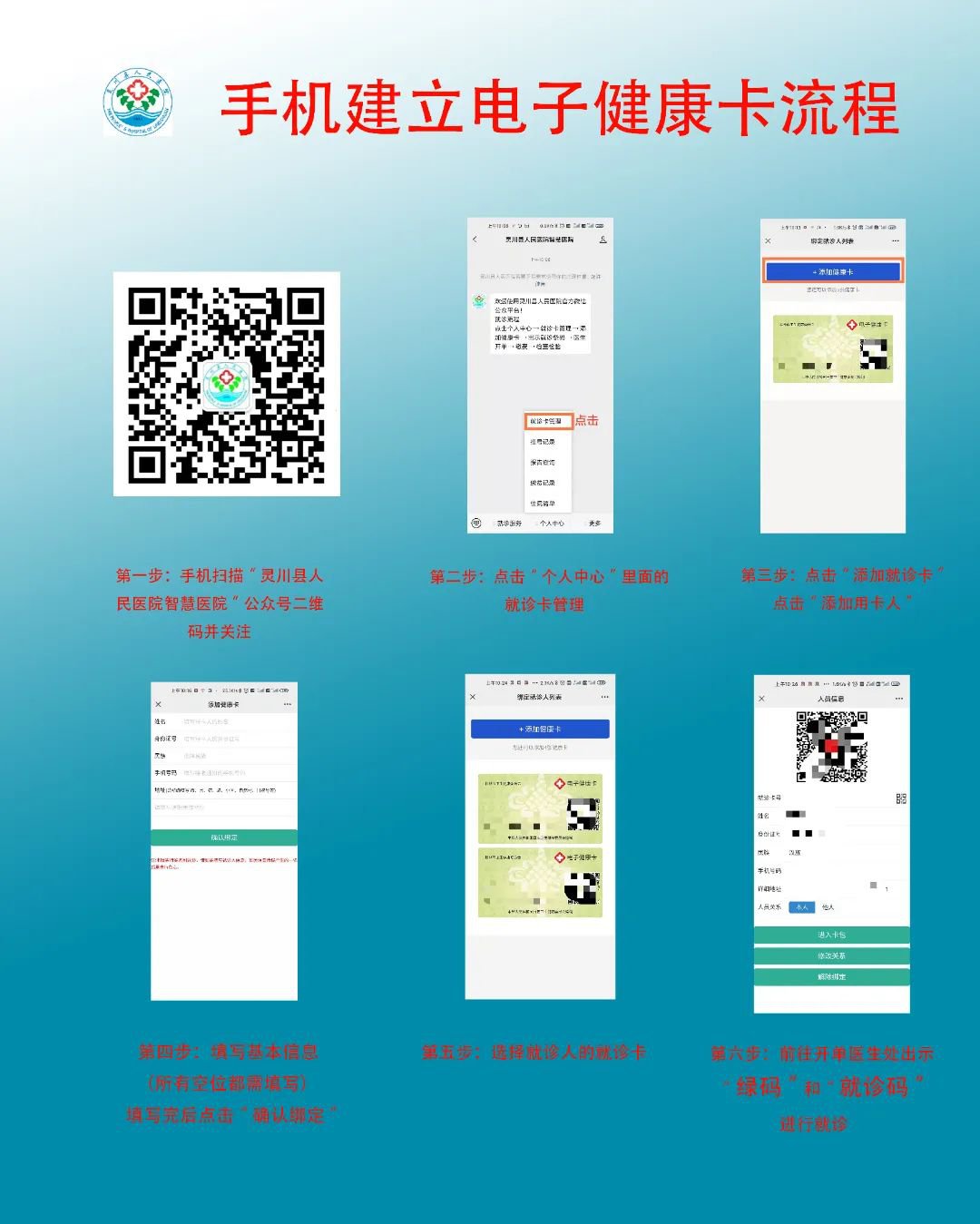 1.扫码关注后→个人中心=就诊卡管理→添加健康卡→出示就诊二维码→医生处就诊