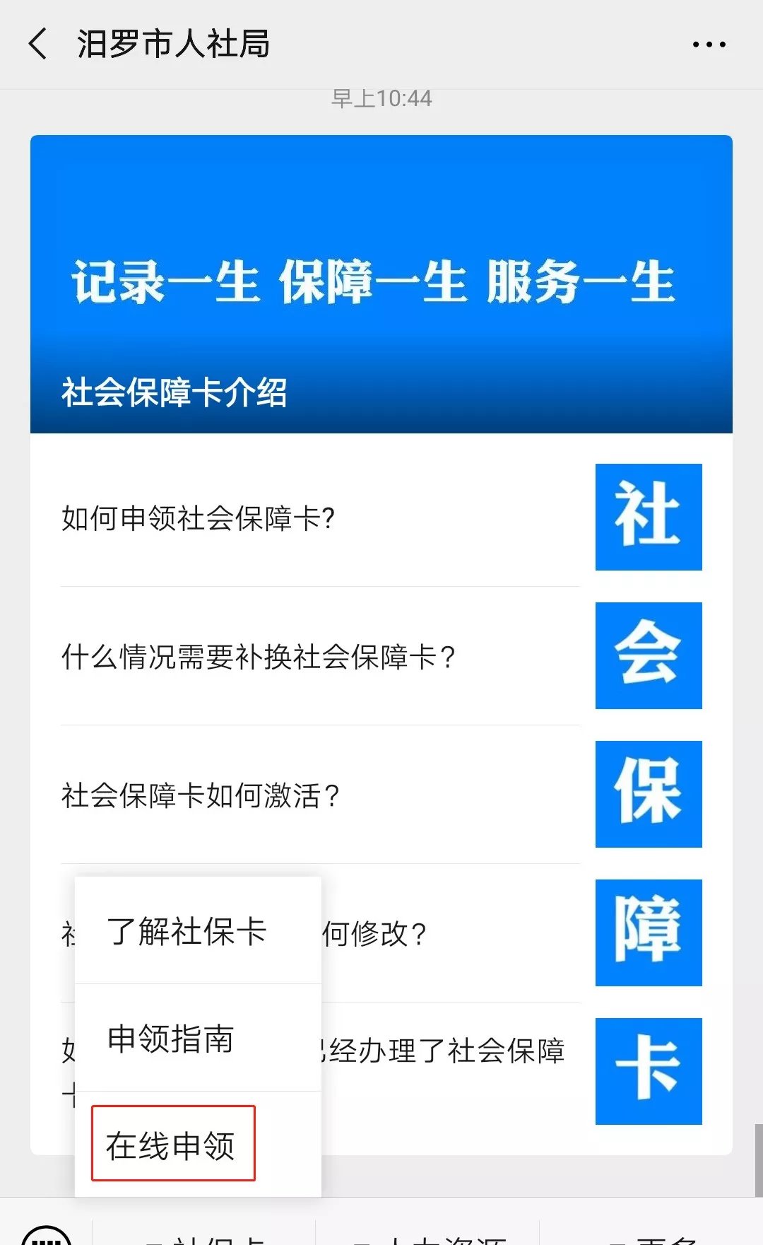 第二步:进入公众号,进入菜单“社保卡——在线申领”