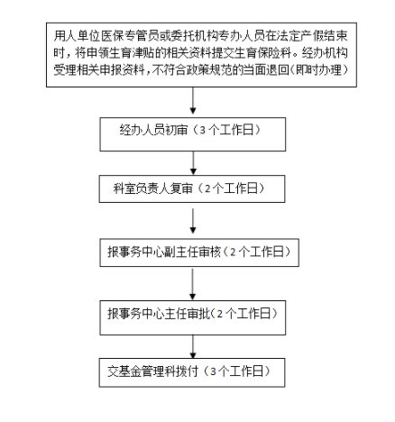 所需材料:由单位携带资料符合法定生育条件的证明原件及复印件、婴儿出生医学证明原件及复印件、出院诊断证明书原件及复印件、《生育津贴申请表》)到参保地医保经办机构办理相关手续,核定好金额后,由单位出具收款收据并提供单位的开户银行名称及账号。办理流程: