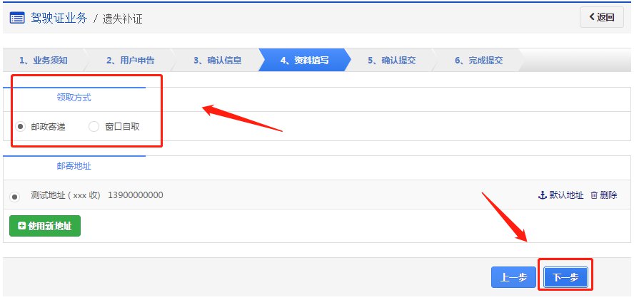 在该步骤,用户选择领取方式是邮政寄递或窗口自取。业务成功受理后,如果选择邮政寄递的,邮政人员将上门收取费用,交付机动车驾驶证及收费票据。如果选择窗口自取的,则自行到选择的自取网点窗口领取机动车驾驶证。