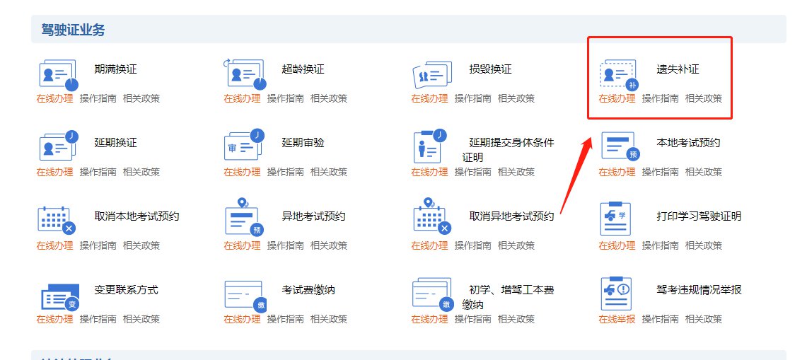 用户在互联网登录后,点击【驾驶证业务】→【遗失补证】业务功能办理。