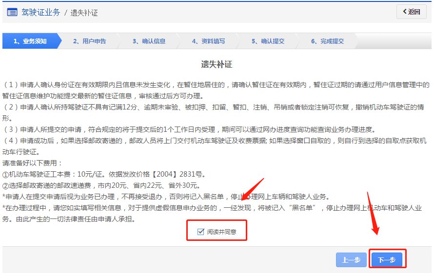 在该步骤,用户需认真阅读其内容,包括:办理遗失补证需要注意的各项内容和相关责任,如下图所示。同意的,勾选“阅读并同意”,点击【下一步】进入步骤2【用户申告】。