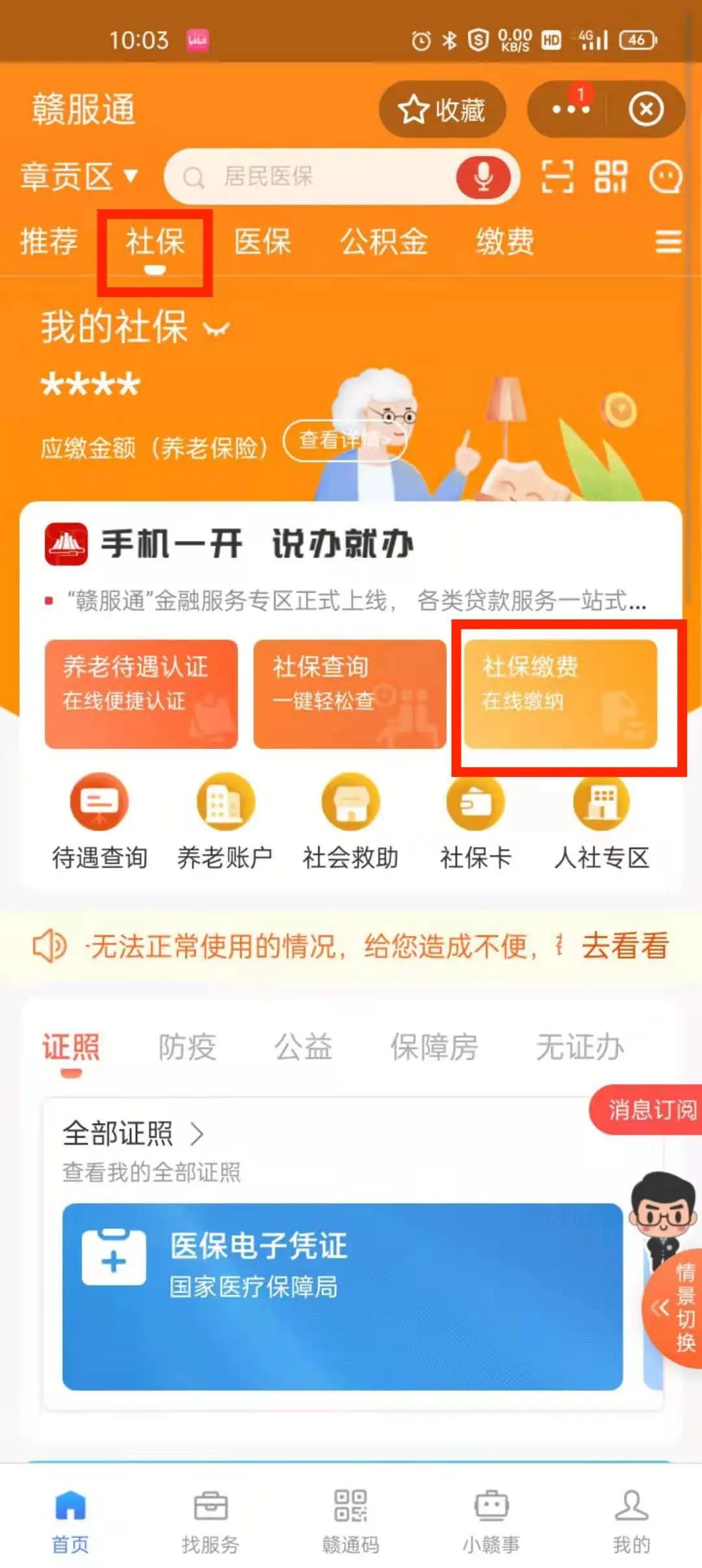 第二步:选择章贡区,点击社保 --> 社保缴费
