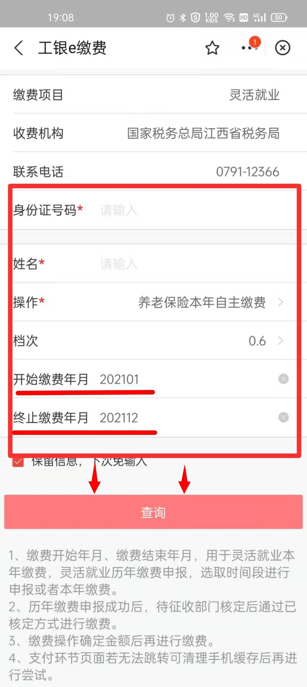 第四步:正确填写个人信息(身份证号码、姓名) --> 选择养老保险本年自主缴费 -->自由选择缴费档次 --> 输入缴费起止年月 --> 点击查询然后缴费