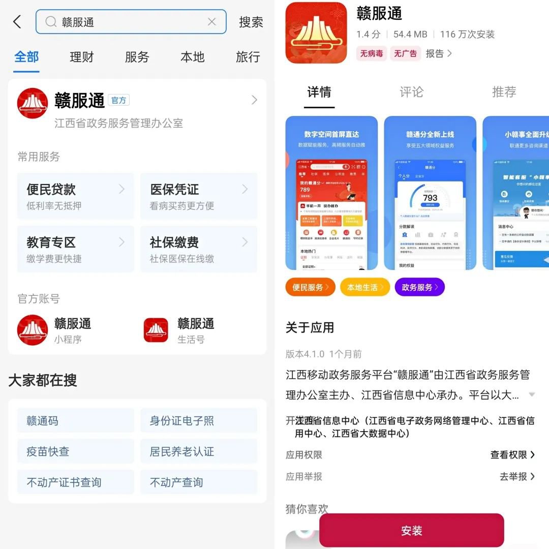 第一步:支付宝搜索“赣服通”并进入或软件商店下载安装“赣服通app”