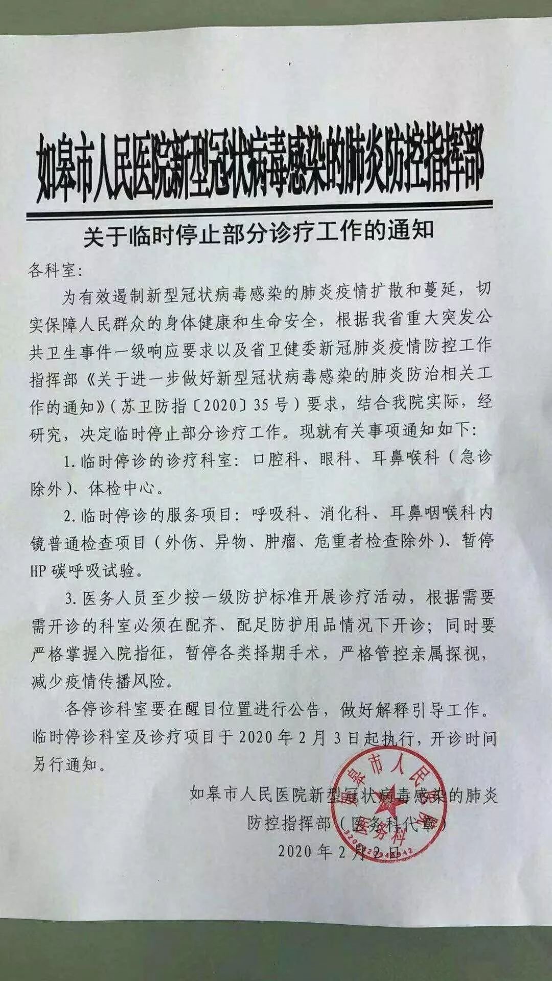 为有效遏制新型冠状病毒感染的肺炎疫情扩散和蔓延,根据南通市卫健委“关于临时停止部分医疗机构诊疗工作的通知”要求,结合我院实际,现将部分工作安排如下: