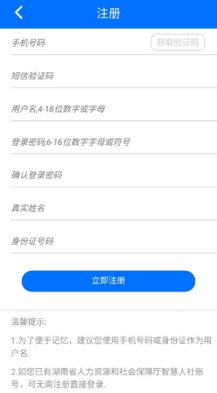 (2)注册页输入手机号码,点击【获取验证码】,输入短信验证码、用户名、密码、真实姓名、身份证号等信息后,点击【立即注册】。成功后即可使用各种功能。