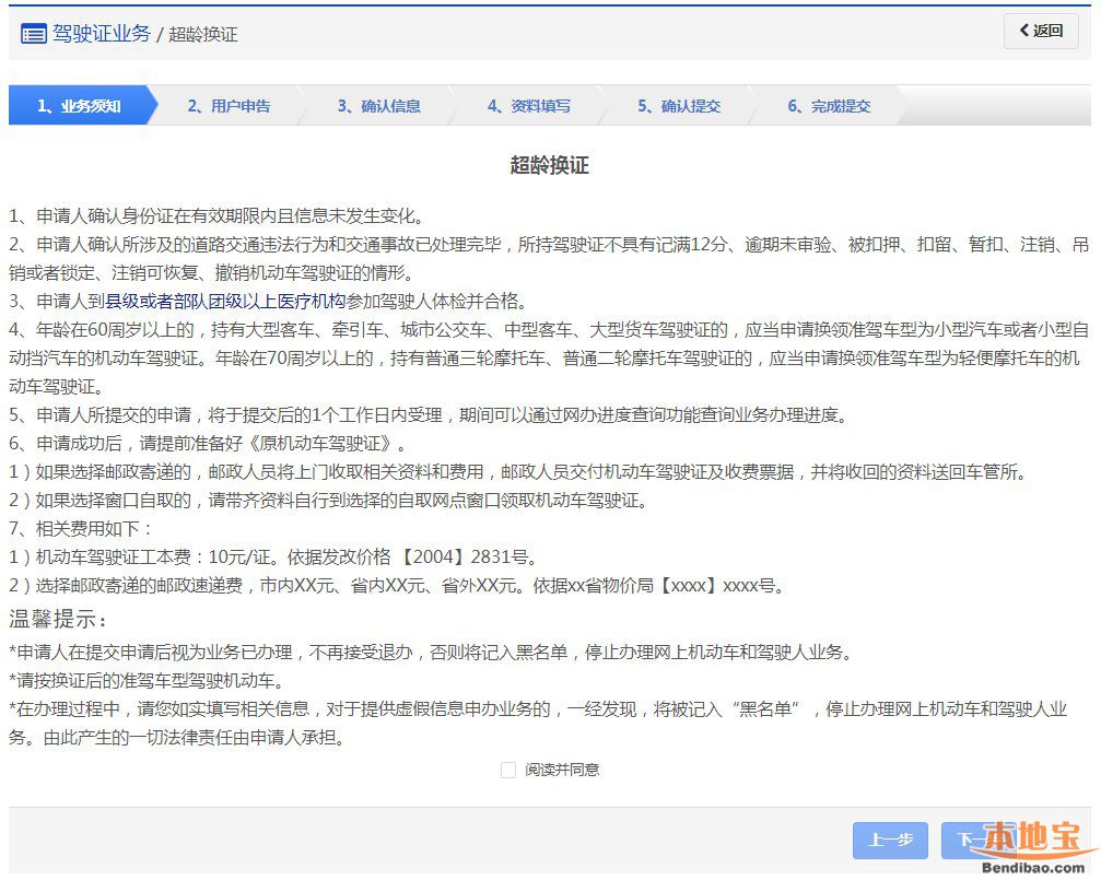 在该步骤,用户需认真阅读其内容,包括:办理超龄换证需要注意的各项内容和相关责任,如下图所示。同意的,勾选“阅读并同意”,点击【下一步】进入步骤2【用户申告】。