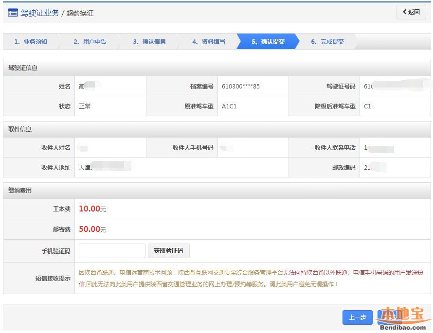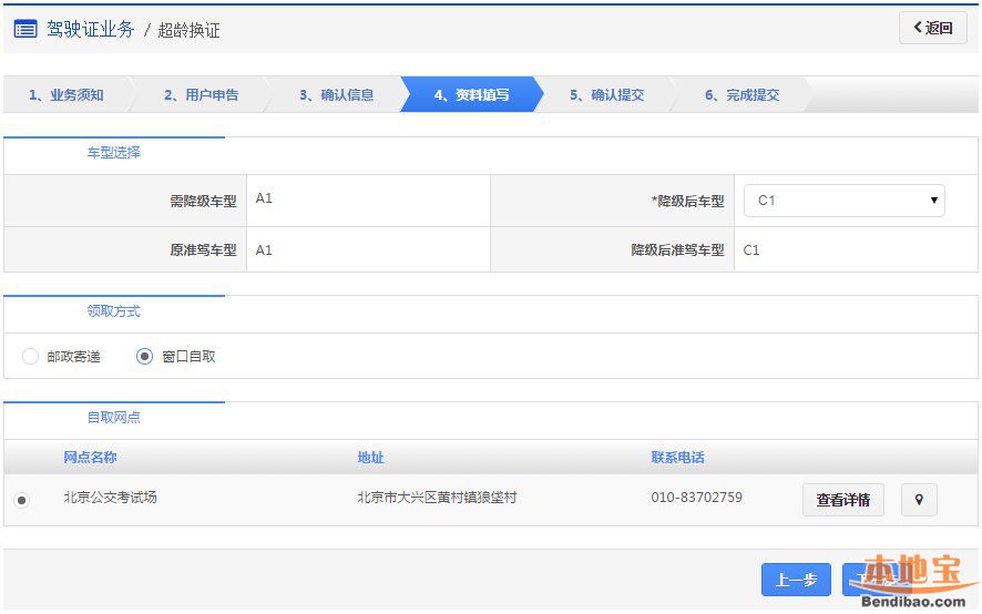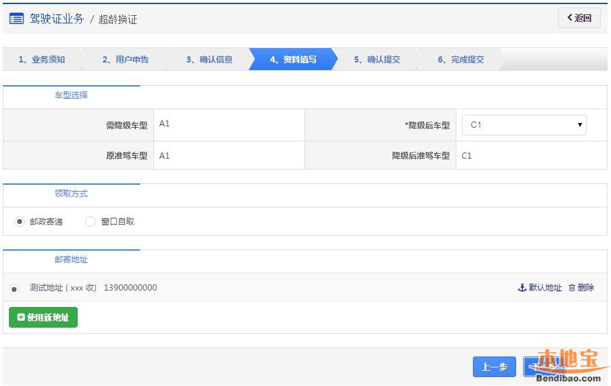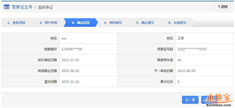 在该步骤,界面显示驾驶证的基本信息,用户认真确认各项信息无误后,点击【下一步】进入步骤4【资料填写】。