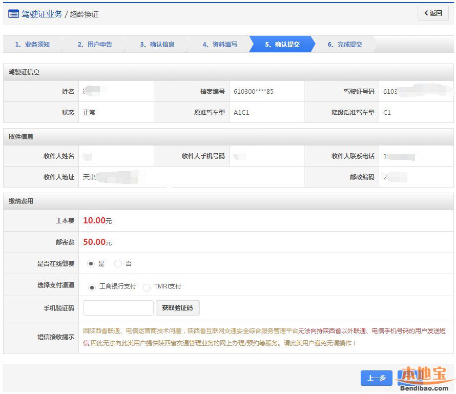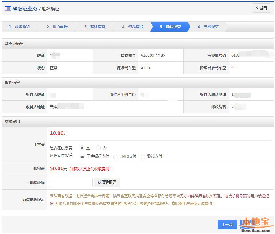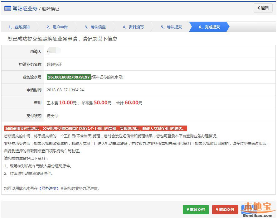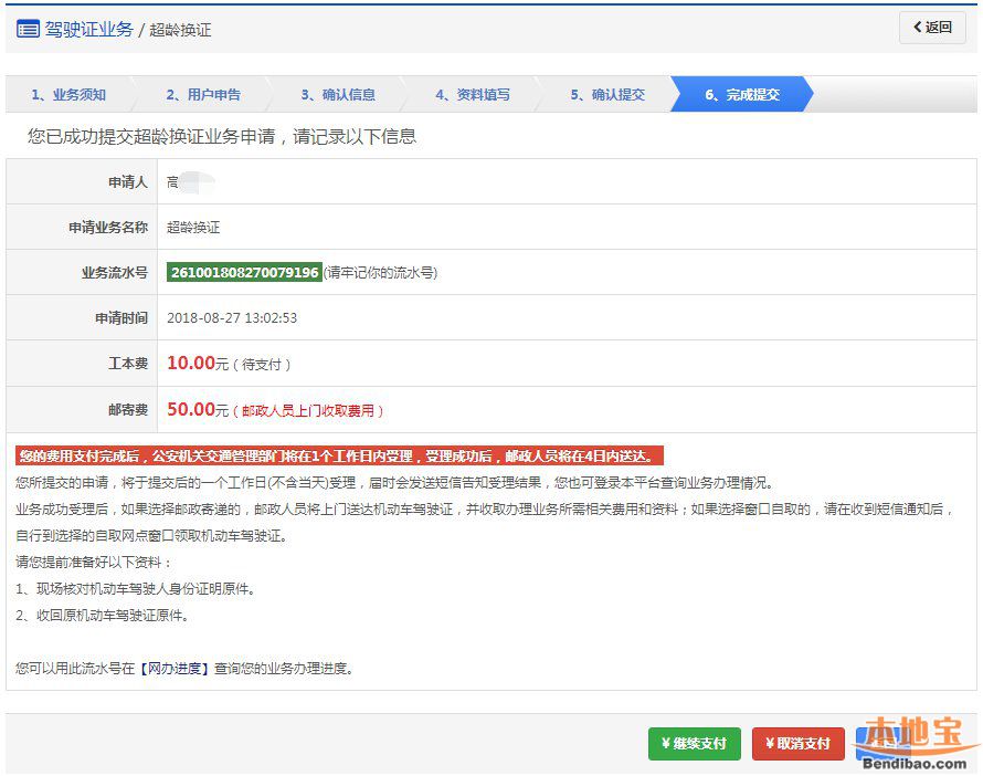该步骤显示用户的驾驶证信息、领取详情以及需要缴纳费用信息,如果平台已开通在线支付功能,显示在线支付详情。