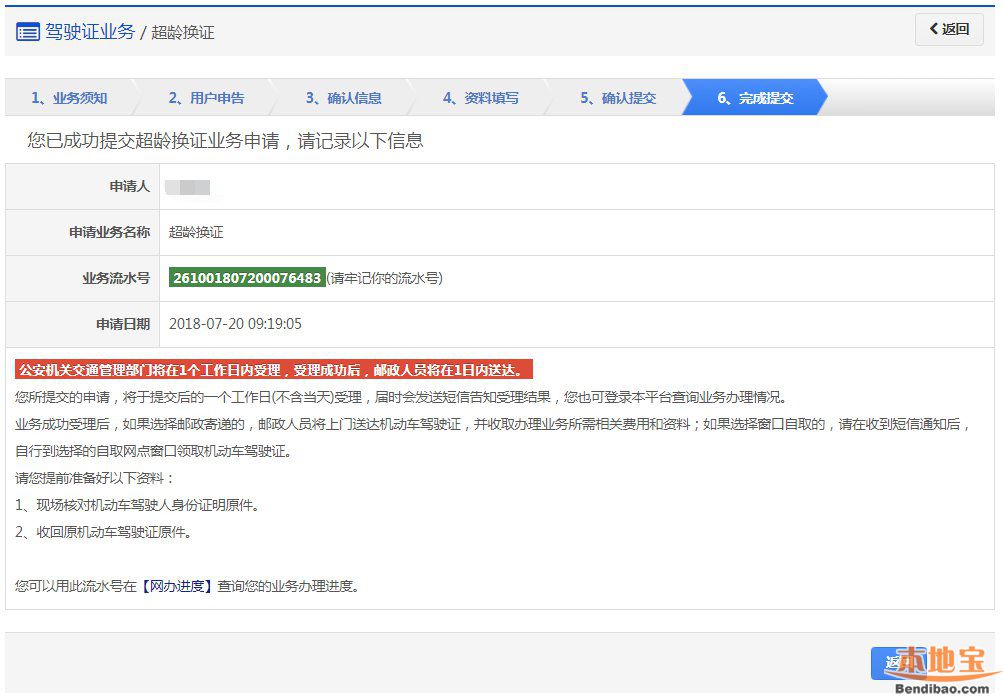 该步骤提交成功后,系统生成业务流水号。该步骤提交成功后,系统将于提交后的一个工作日(不含当天)受理(选择在线支付的业务费用支付完成后受理),届时会发送短信告知受理结果。用户可以根据该业务流水号在网办进度中查询业务办理进度。