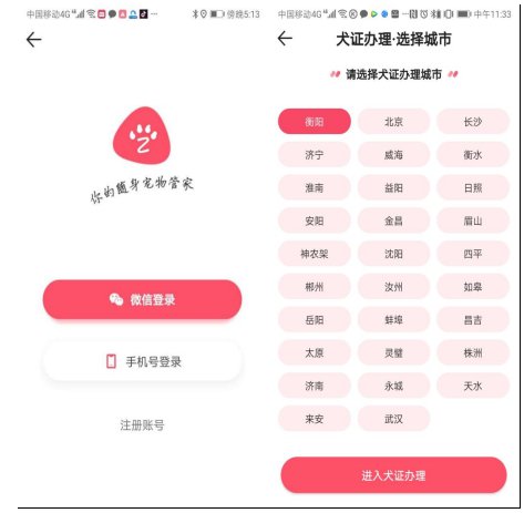 2、注册完成后,登陆APP,点击“犬证办理”,选择城市“衡阳”。