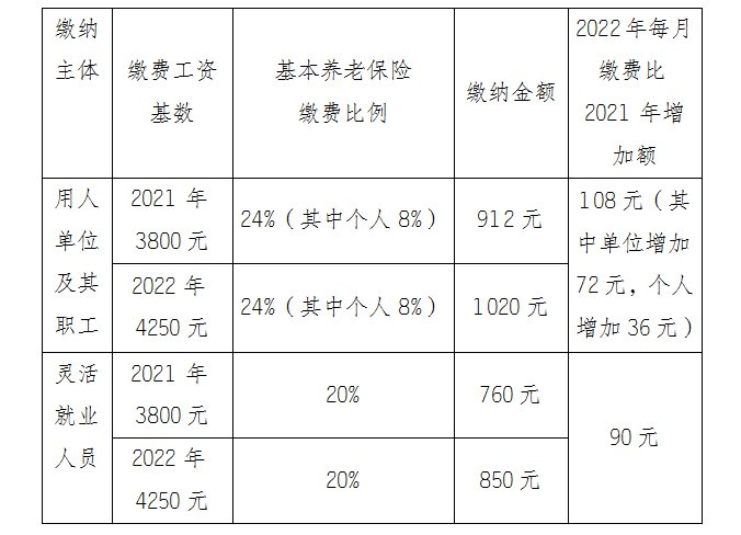由此可见,缴费工资基数上下限标准的调整并不是对所有参保人员都造成影响,对于自身的工资收入在上下限范围内的人群,上下限标准的调整并不会产生直接的影响。同时,即便是按缴费工资基数下限缴费的人群,下限标准的提高对缴费金额的影响也是有限的。我们对2021年和2022年按下限标准缴纳基本养老保险费的人群做了对比,具体见下表: