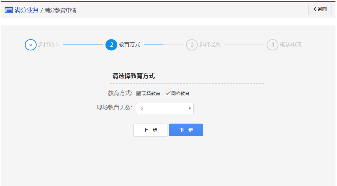 步骤2:【教育方式】在该步骤,用户选择教育方式,并确认现场教育天数(系统自动计算最少需要参加现场教育天数,选择天数不能少于该值)。选择"现场+网络教育"方式,请确保具备网络学习条件(电脑、摄像头、带宽)。 点击【下一步】,进入步骤3:【选择场次】。