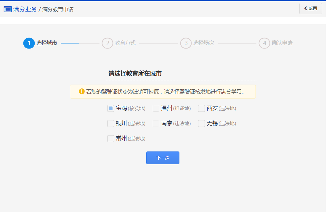 步骤1:【选择城市】在该步骤,用户选择现场教育城市。请从列出的城市中选择一个教育城市,点击【下一步】。