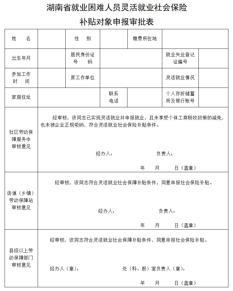 1.被认定的灵活就业困难人员、离校1年内未就业的高校毕业生,可于季度终了后10个工作日内持本人《居民身份证》、《就业失业登记证》(或《就业创业证》)、户口簿、从事灵活就业的岗位和地址等内容的相关证明材料、个人银行存折或银行卡的原件及复印件、缴纳社会保险费原始单据(距退休不足五年的需出具退休年龄的相关证明、离校1年内未就业的高校毕业生需提供毕业证原件及复印件),到发证地所在社区人力资源和社会保障中心提出社会保险补贴申请,填写《湖南省就业困难人员灵活就业社会保险补贴对象申报审批表》(附件1,以下简称《审批表》)。