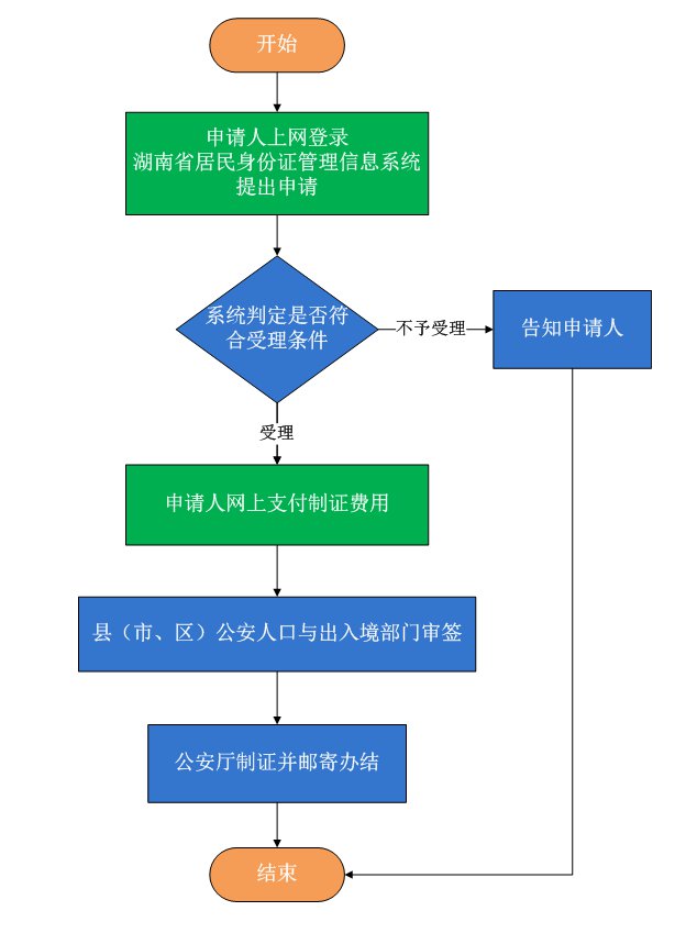 申请人网上提交申请业务信息和资料—湖南省居民身份证管理信息系统受理—支付制证费—县(市、区)公安人口与出入境部门审签—制证并邮寄办结