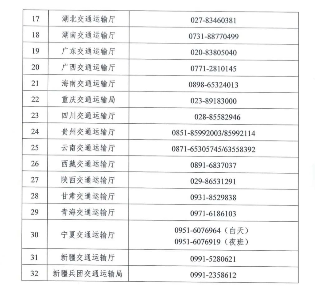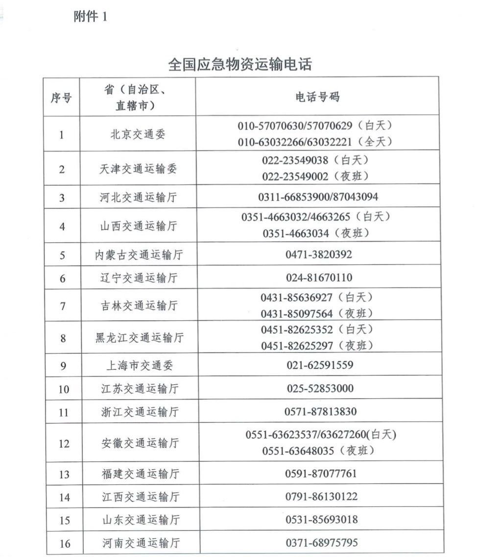 为及时受理和解决应急物资运输车辆通行中的相关问题,切实保障车辆的顺畅高效通行,交通运输部在《通知》中向社会公开了全国各省(区、市)交通运输厅(局、委)应急运输电话。