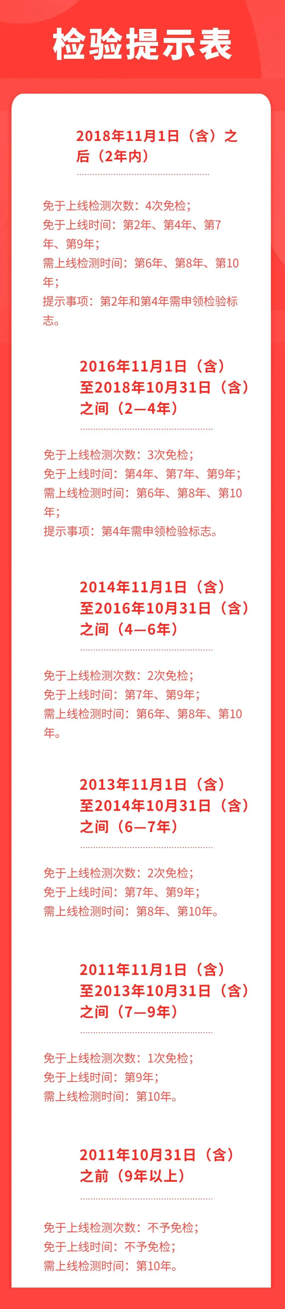 在用车第7年已按规定检验的,第8年免检,第9年、第10年需正常参加检验。在用车第9年已按规定检验的,不享受免检政策,第10年需正常参加检验。