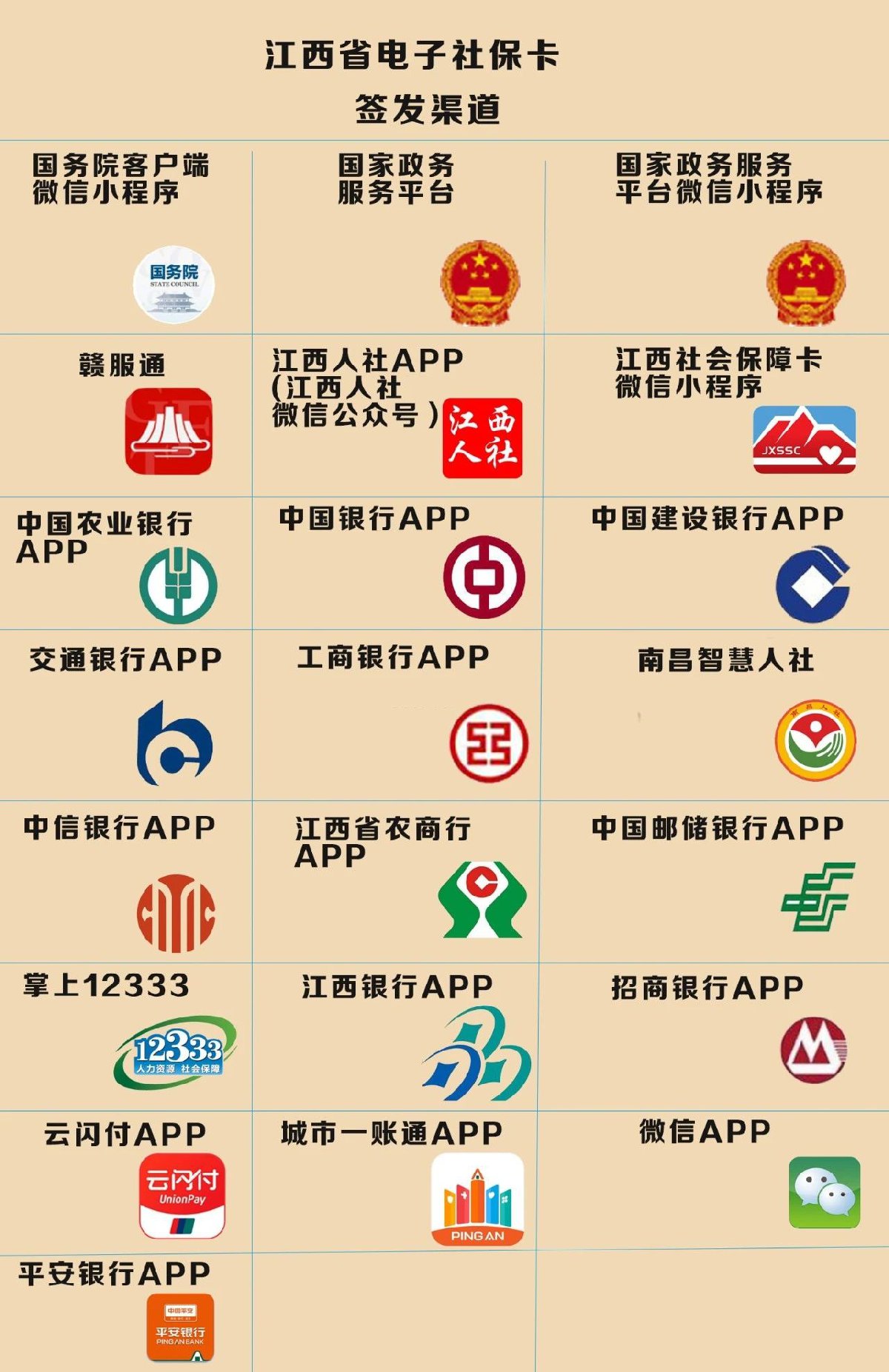 江西省参保群众可通过赣服通(点此扫码进入)、江西人社APP(江西人社微信公众号)、“江西社会保障卡”小程序(点此扫码进入)、南昌智慧人社、江西省农商行APP、中信银行APP、江西银行APP等22个渠道签发电子社保卡。