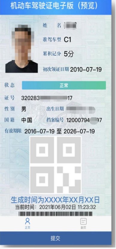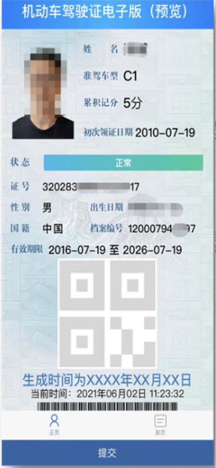 电子驾驶证由正页和副页两部分组成。其中,正页主要包括驾驶证基本信息、电子证生成时间、用于验证信息的二维码和一维码等内容;副页主要包括驾驶人住址、发证机关、驾驶记录以及准驾车型代号规定等内容。主要特点有: