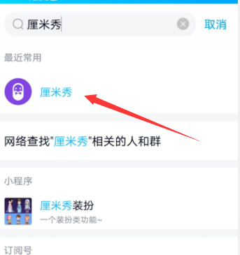 打开手机QQ,在搜索框输入【厘米秀】;在搜索结果里点击【厘米秀】即可进入。