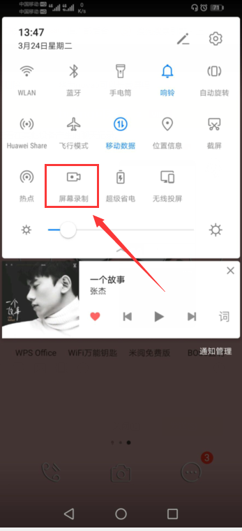 以华为nova5手机为例,自带录屏在下拉通知栏里,在通知栏里,找到并点击【屏幕录制】选项即可录制屏幕。