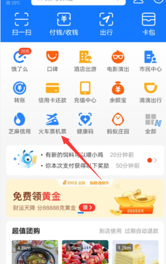 1、打开手机上的支付宝APP,进入后在首页点击【火车票机票】选项。