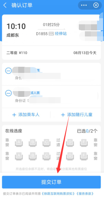 5、输入乘车人信息、选择好座位后,点击【提交订单】即可。