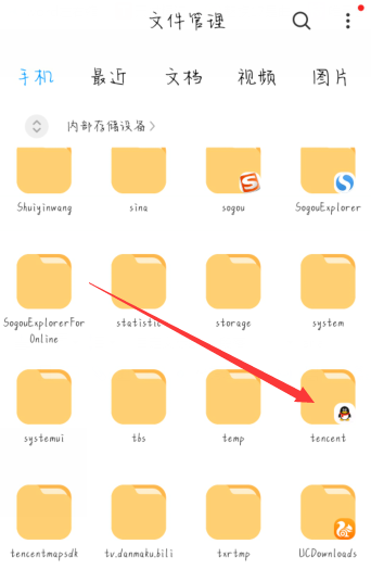 2、打开文件管理,在手机内存中找到【Tencent】文件夹。