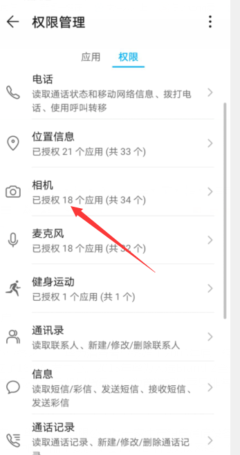 3、在权限页面中点击相机。