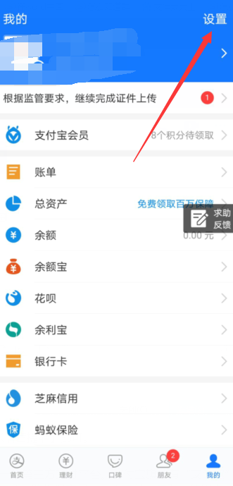 1、首先打开【支付宝】,在支付宝【我的】界面里,点击右上角的【设置】选项。