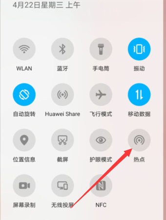 1、打开手机,下拉通知栏,找到并长按【热点】按钮。