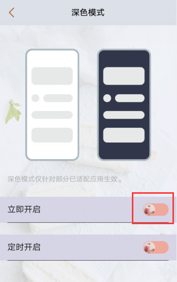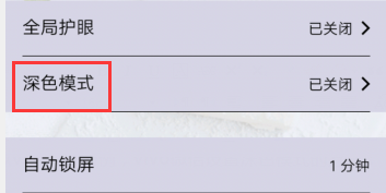2、点击深色模式,打开深色模式右侧的开关按钮即可。